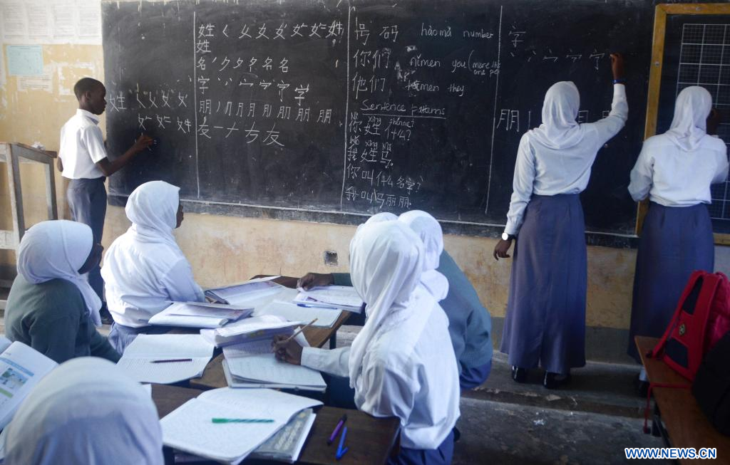 KAMPALA, 21 février (Xinhua) -- Des étudiants assistent à un cours de chinois au lycée musulman Kawempe à Kampala en Ouganda, le 20 février 2023. Plus de 600 étudiants ont repris lundi les cours de chinois dans les écoles secondaires après deux mois de vacances à Kampala. (Xinhua/Nicholas Kajoba)