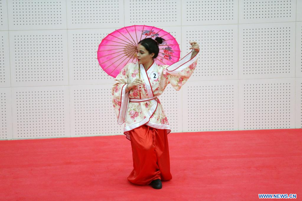 Une participante à la 22e édition du concours Pont vers le chinois pour l'apprentissage de la langue chinoise, à Alger, en Algérie, le 24 mai 2023. (Xinhua)