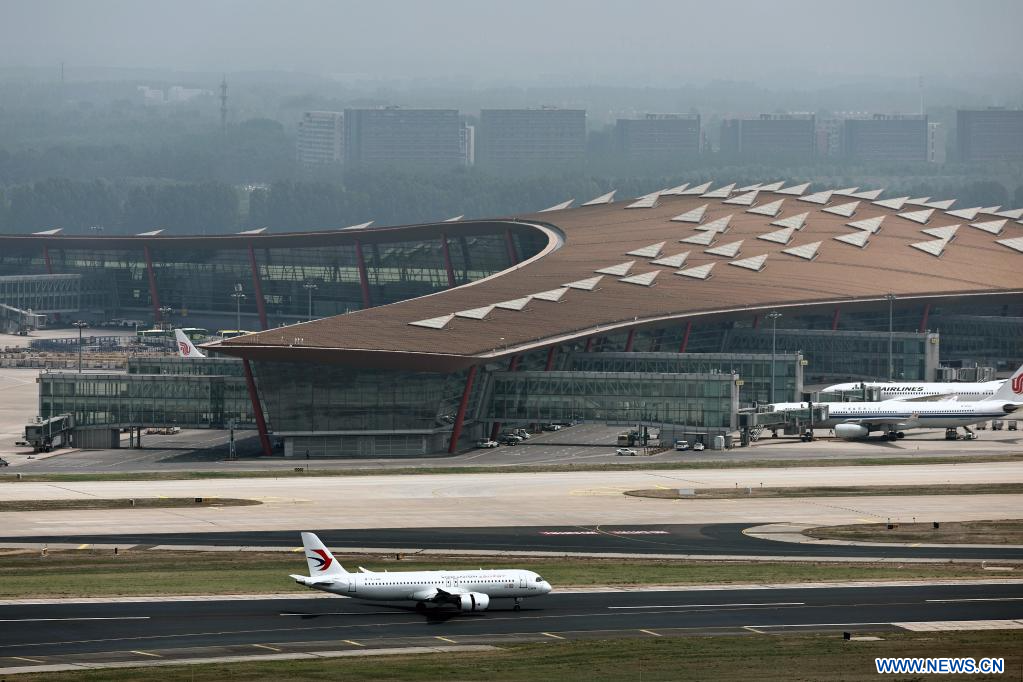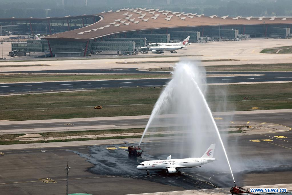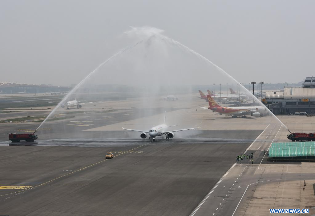 L'avion a été accueilli par des jets d'eau après son atterrissage dimanche, à 12h31, à l'Aéroport international de la Capitale de Beijing.