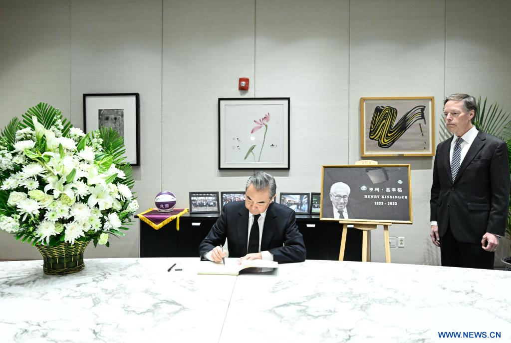 M. Wang, membre du Bureau politique du Comité central du Parti communiste chinois (PCC) et directeur du Bureau de la Commission des Affaires étrangères du Comité central du PCC, a écrit dans le livre de condoléances et a exprimé ses profondes condoléances pour le décès du Dr Kissinger.