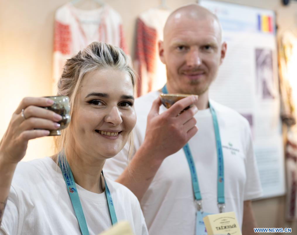 QUANZHOU, 10 décembre (Xinhua) -- Une artiste russe et son partenaire présentent des tasses en céramique qu'ils ont créées, lors d'une exposition sur le patrimoine culturel immatériel de la Route de la soie maritime, à Quanzhou, dans la province chinoise du Fujian (sud-est), le 9 décembre 2023. La ville de Quanzhou est reconnue comme le point de départ de l'ancienne Route de la soie maritime. (Photo : Wei Peiquan)