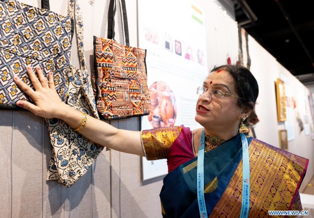 QUANZHOU, 10 décembre (Xinhua) -- Une artiste indienne présente des sacs réalisés à la main, lors d'une exposition sur le patrimoine culturel immatériel de la Route de la soie maritime, à Quanzhou, dans la province chinoise du Fujian (sud-est), le 9 décembre 2023. La ville de Quanzhou est reconnue comme le point de départ de l'ancienne Route de la soie maritime. (Photo : Wei Peiquan)