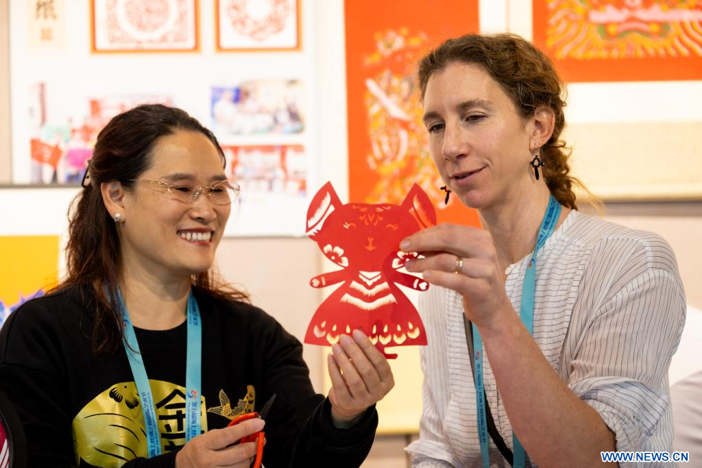 QUANZHOU, 10 décembre (Xinhua) -- Une artiste italienne (à droite) apprend les techniques du papier découpé auprès de You Jinmei, une héritière du patrimoine culturel immatériel, lors d'une exposition sur le patrimoine culturel immatériel de la Route de la soie maritime, à Quanzhou, dans la province chinoise du Fujian (sud-est), le 9 décembre 2023. La ville de Quanzhou est reconnue comme le point de départ de l'ancienne Route de la soie maritime. (Photo : Wei Peiquan)