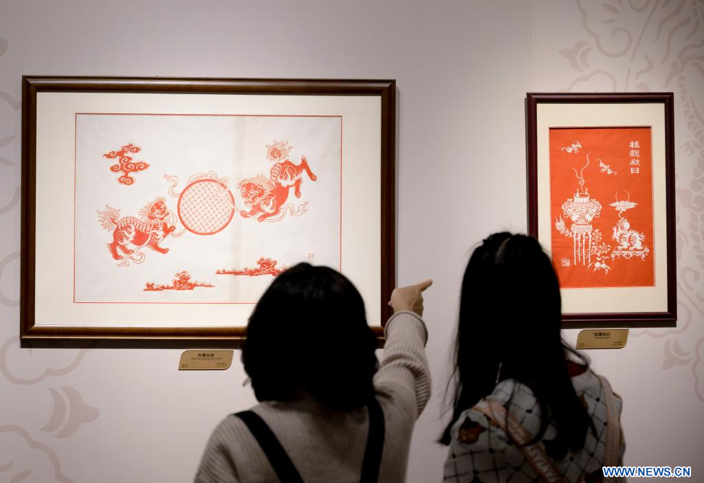QUANZHOU, 10 décembre (Xinhua) -- Des visiteuses contemplent des œuvres présentées à une exposition sur le patrimoine culturel immatériel de la Route de la soie maritime, à Quanzhou, dans la province chinoise du Fujian (sud-est), le 9 décembre 2023. La ville de Quanzhou est reconnue comme le point de départ de l'ancienne Route de la soie maritime. (Photo : Wei Peiquan)