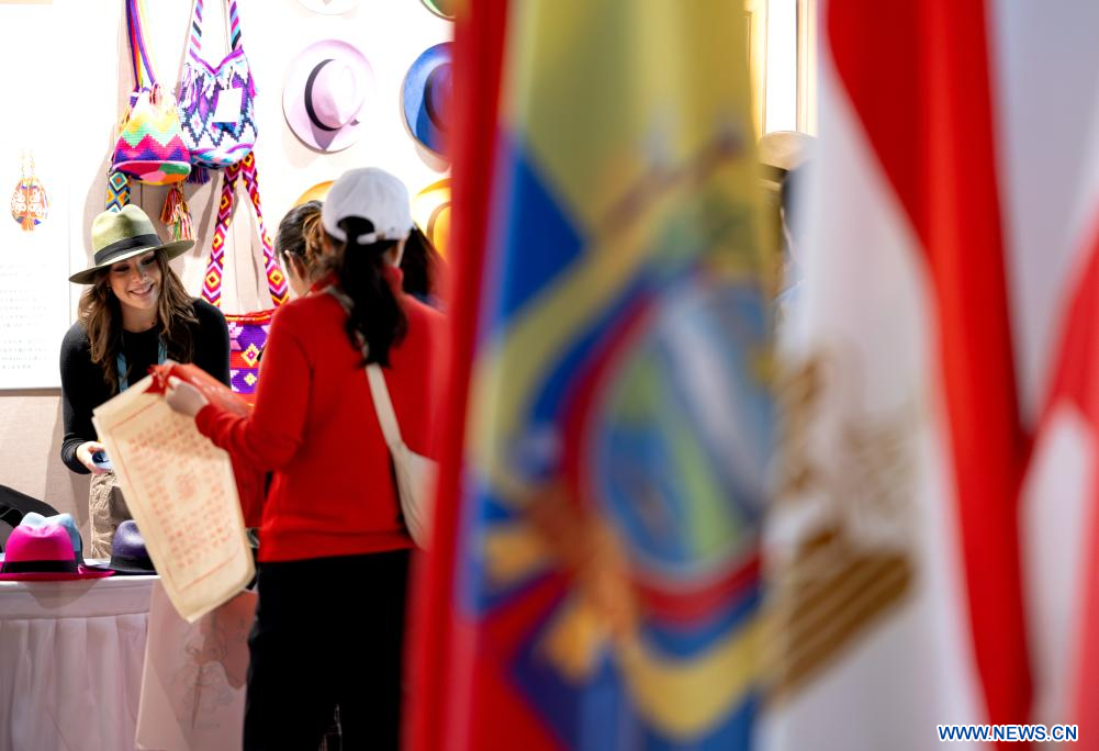 QUANZHOU, 10 décembre (Xinhua) -- Des visiteurs choisissent des produits équatoriens, lors d'une exposition sur le patrimoine culturel immatériel de la Route de la soie maritime, à Quanzhou, dans la province chinoise du Fujian (sud-est), le 9 décembre 2023. La ville de Quanzhou est reconnue comme le point de départ de l'ancienne Route de la soie maritime. (Photo : Wei Peiquan)