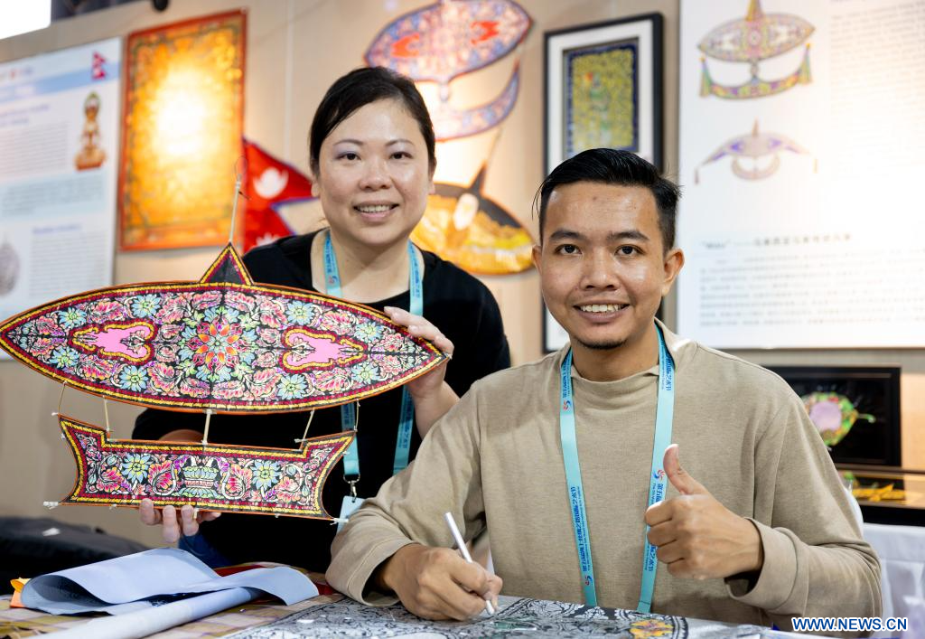 QUANZHOU, 10 décembre (Xinhua) -- Un artiste malaisien et sa partenaire présentent un cerf-volant, lors d'une exposition sur le patrimoine culturel immatériel de la Route de la soie maritime, à Quanzhou, dans la province chinoise du Fujian (sud-est), le 9 décembre 2023. La ville de Quanzhou est reconnue comme le point de départ de l'ancienne Route de la soie maritime. (Photo : Wei Peiquan)