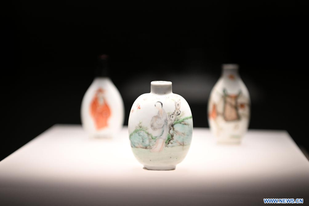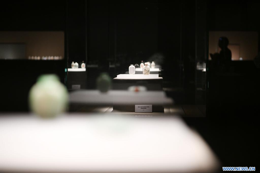 YINCHUAN, 11 décembre (Xinhua) -- Des tabatières exposées au musée du Ningxia à Yinchuan, dans la région autonome Hui du Ningxia, dans le nord-ouest de la Chine, le 10 décembre 2023. L'exposition présente 26 tabatières du musée du Ningxia et 236 tabatières du musée des Trois Gorges de Chine à Chongqing (sud-ouest). (Photo : Wang Peng)