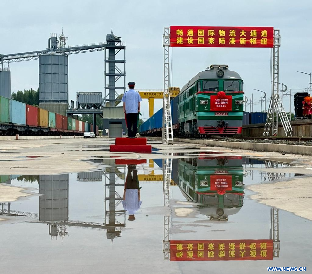 Le train de fret transportant des matériaux de construction, des appareils électroménagers, des vêtements et d'autres produits a quitté le Centre de logistique de l'arrondissement de Pinggu, dans le nord-est de la ville.