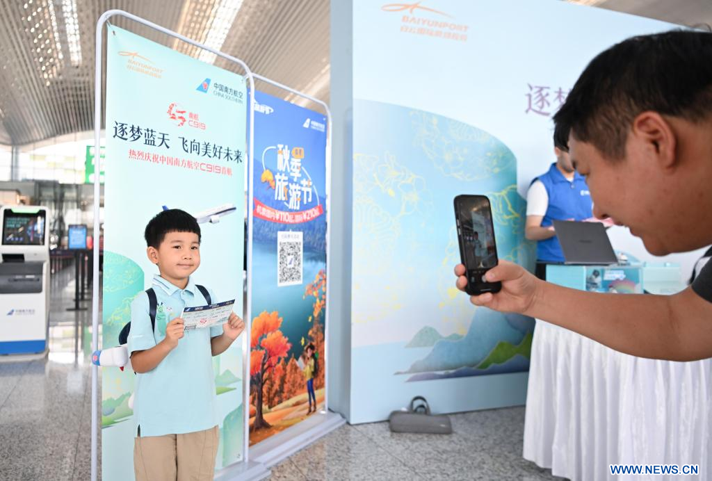 GUANGZHOU, 19 septembre (Xinhua) -- Un avion de passagers C919 exploité par la China Southern Airlines a décollé jeudi de l'aéroport international Baiyun de Guangzhou, marquant le premier vol commercial du C919 de cette compagnie aérienne basée à Guangzhou.