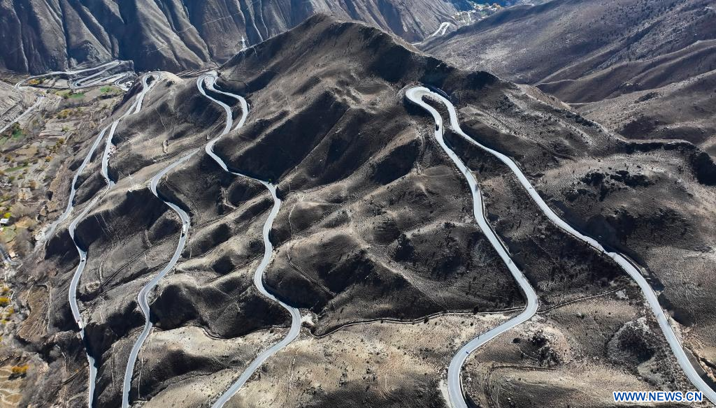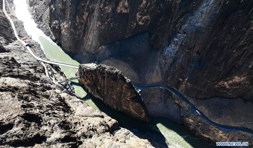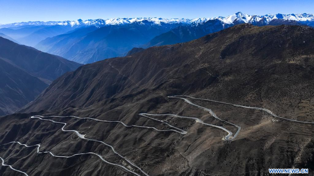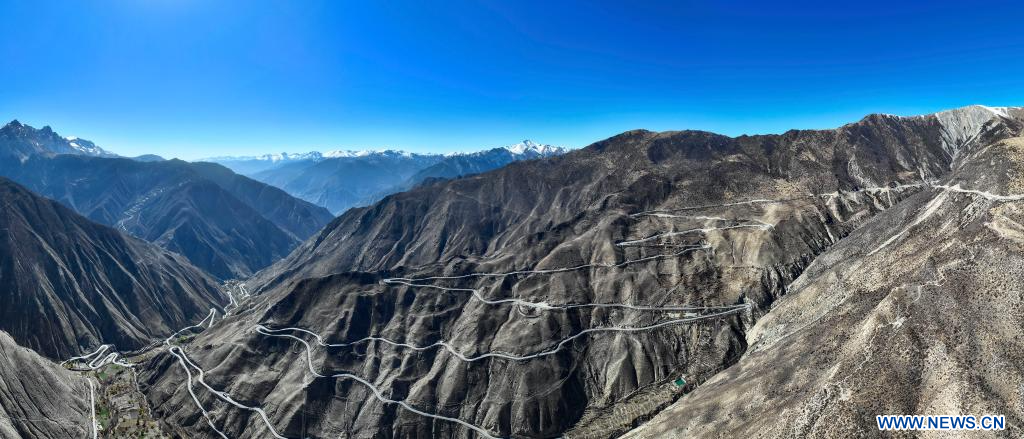 BAXOI, 17 novembre (Xinhua) -- Photo aérienne d'une partie d'une route en zigzag près de la rivière Nujiang, dans le district de Baxoi, dans la région autonome du Xizang (sud-ouest de la Chine), le 16 novembre 2024. (Photo : Purbu Tsering)