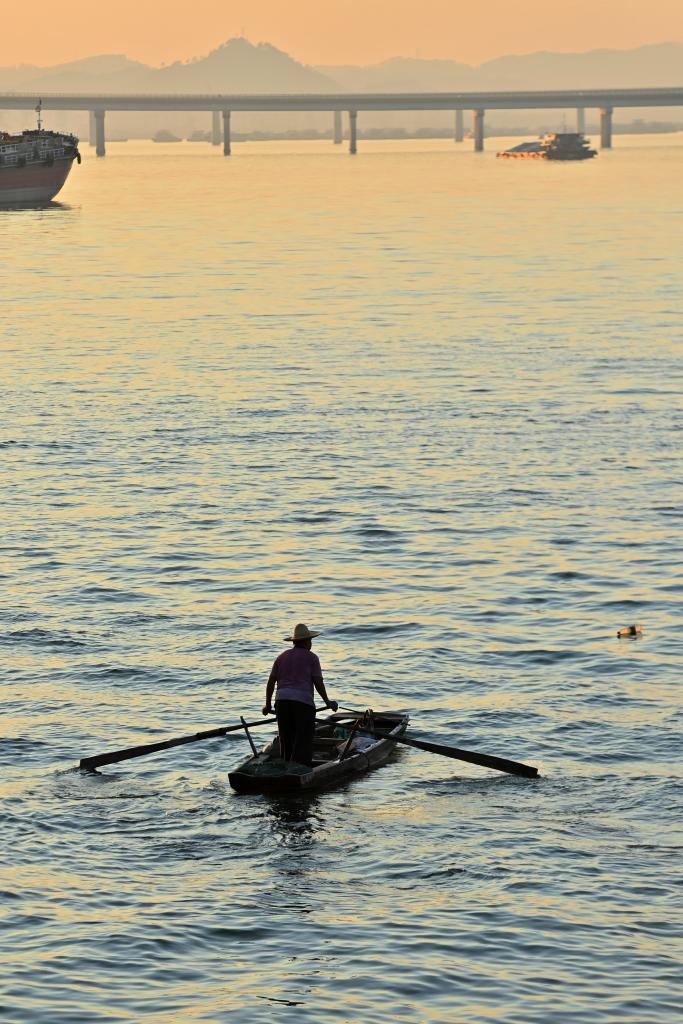 WUZHOU, 18 novembre (Xinhua) -- Un villageois rame sur la rivière Xijiang dans le village de Sizhou, dans l'arrondissement de Changzhou, dans l'arrondissement de Changzhou, à Wuzhou, ville de la région autonome Zhuang du Guangxi (sud de la Chine), le 12 novembre 2024. Installé sur l'île de Sizhou, au milieu de la rivière Xijiang, le village bénéficie d'un riche patrimoine culturel immatériel et d'un magnifique paysage naturel. Ces atouts ont permis à Sizhou de devenir une destination touristique prisée. (Photo : Huang Xiaobang)