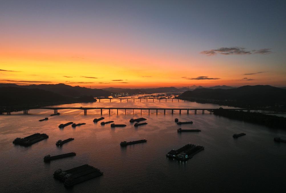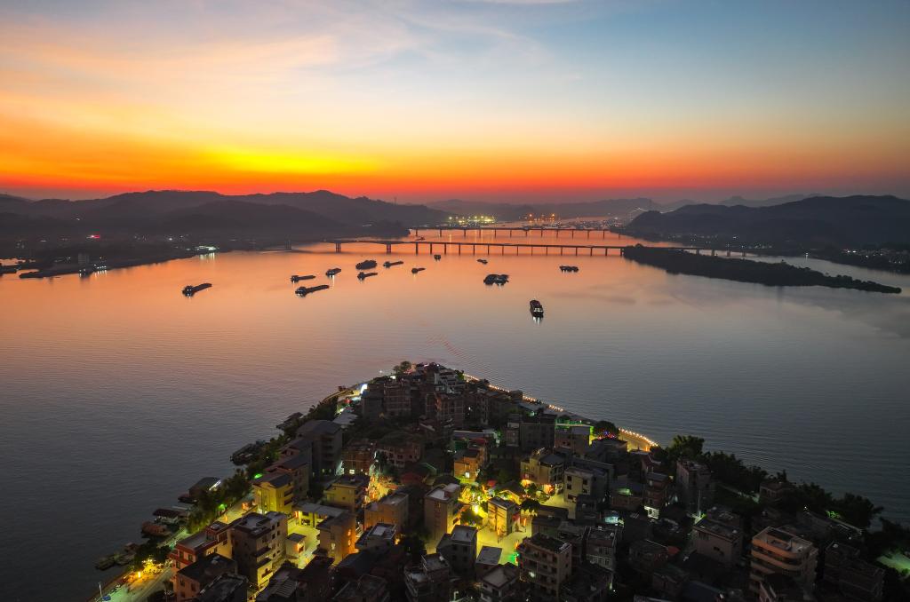 WUZHOU, 18 novembre (Xinhua) -- Photo prise par un drone montrant le paysage au coucher du soleil près du village de Sizhou, dans l'arrondissement de Changzhou, à Wuzhou, ville de la région autonome Zhuang du Guangxi (sud de la Chine), le 15 novembre 2024. Installé sur l'île de Sizhou, au milieu de la rivière Xijiang, le village bénéficie d'un riche patrimoine culturel immatériel et d'un magnifique paysage naturel. Ces atouts ont permis à Sizhou de devenir une destination touristique prisée. (Photo : Huang Xiaobang)