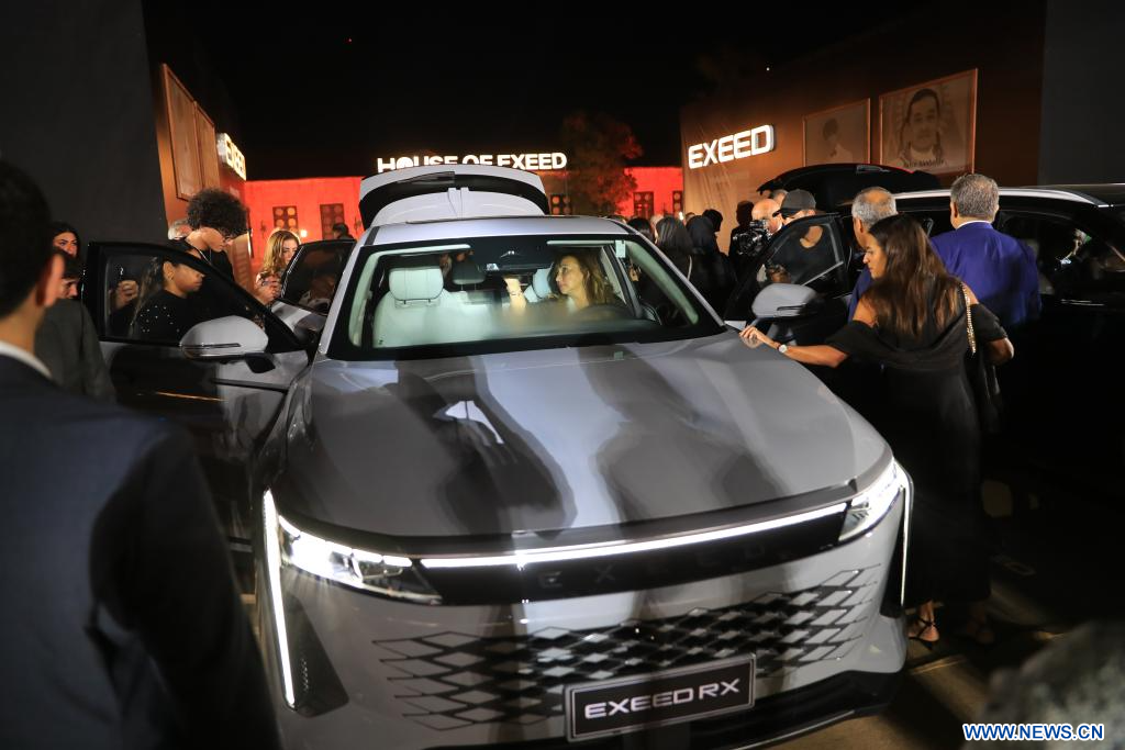 LE CAIRE, 20 novembre (Xinhua) -- Des visiteurs observent un modèle de SUV Exeed lors de la cérémonie de son lancement dans le nord du Grand Caire, en Egypte, le 18 novembre 2024. La marque automobile chinoise Exeed, une filiale du constructeur automobile Chery, a introduit deux modèles de SUV, Exeed RX et Exeed VX, sur le marché égyptien. (Xinhua/Sui Xiankai)