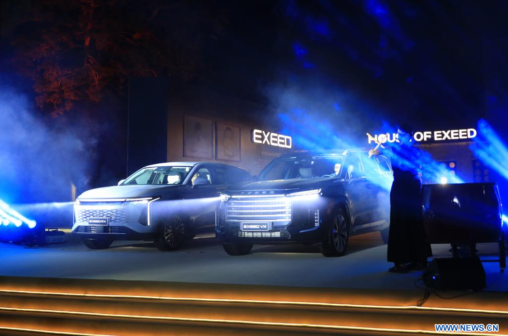 LE CAIRE, 20 novembre (Xinhua) -- Photo prise le 18 novembre 2024 montrant deux modèles de SUV Exeed lors de la cérémonie de leur lancement dans le nord du Grand Caire, en Egypte. La marque automobile chinoise Exeed, une filiale du constructeur automobile Chery, a introduit deux modèles de SUV, Exeed RX et Exeed VX, sur le marché égyptien. (Xinhua/Sui Xiankai)