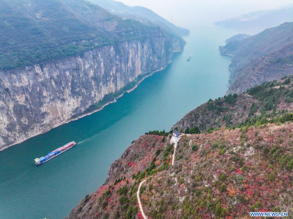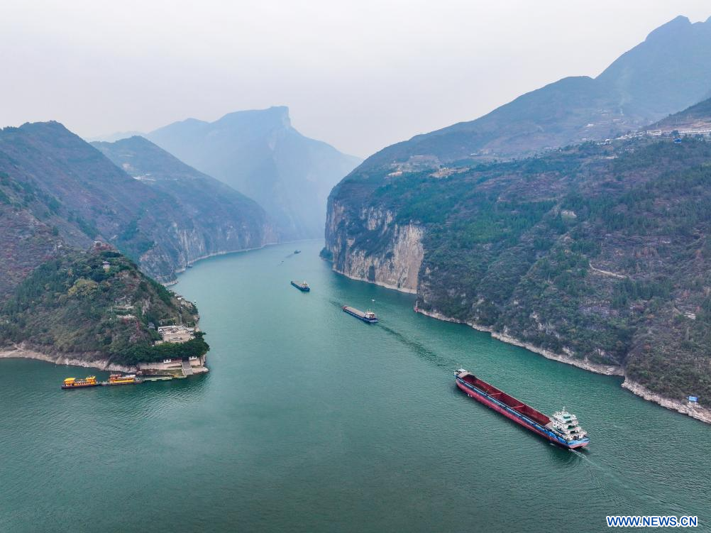 CHONGQING, 20 décembre (Xinhua) -- Photo aérienne de bateaux naviguant dans la gorge Qutang, l'une des Trois gorges sur le fleuve Yangtsé, dans le district de Fengjie de la municipalité de Chongqing (sud-ouest de la Chine), le 19 décembre 2024. (Photo : Wang Quanchao)