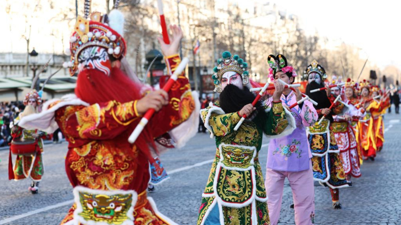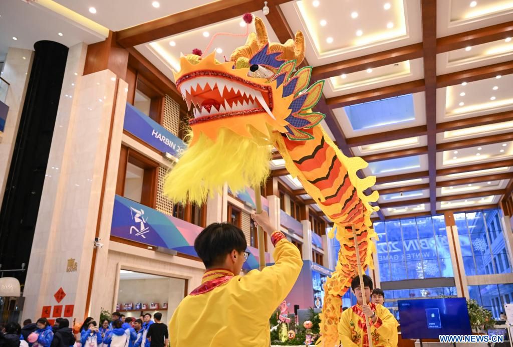 YABULI, 13 février (Xinhua) -- Des artistes présentent une danse du dragon pour célébrer la fête des Lanternes au centre de presse des 9es Jeux asiatiques d'hiver, à Yabuli, dans la province chinoise du Heilongjiang (nord-est), le 12 février 2025. (Photo : Hu Huhu)