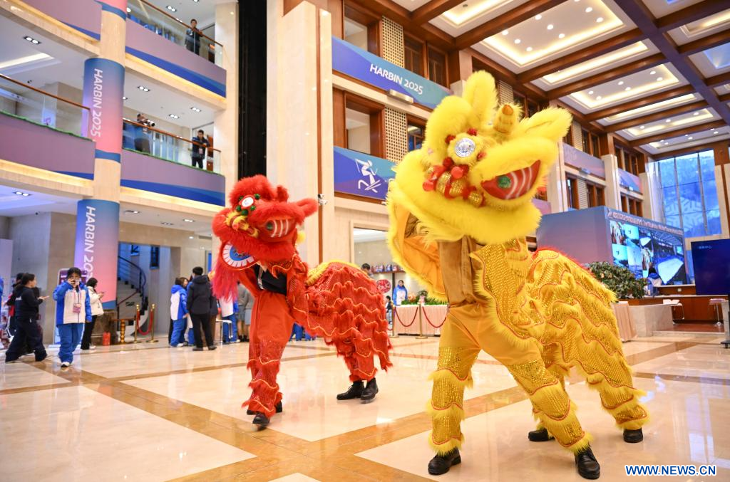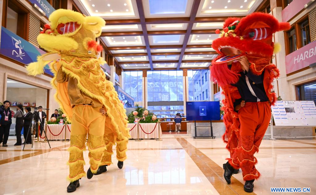 YABULI, 13 février (Xinhua) -- Des artistes présentent une danse du lion pour célébrer la fête des Lanternes au centre de presse des 9es Jeux asiatiques d'hiver, à Yabuli, dans la province chinoise du Heilongjiang (nord-est), le 12 février 2025. (Photo : Hu Huhu)