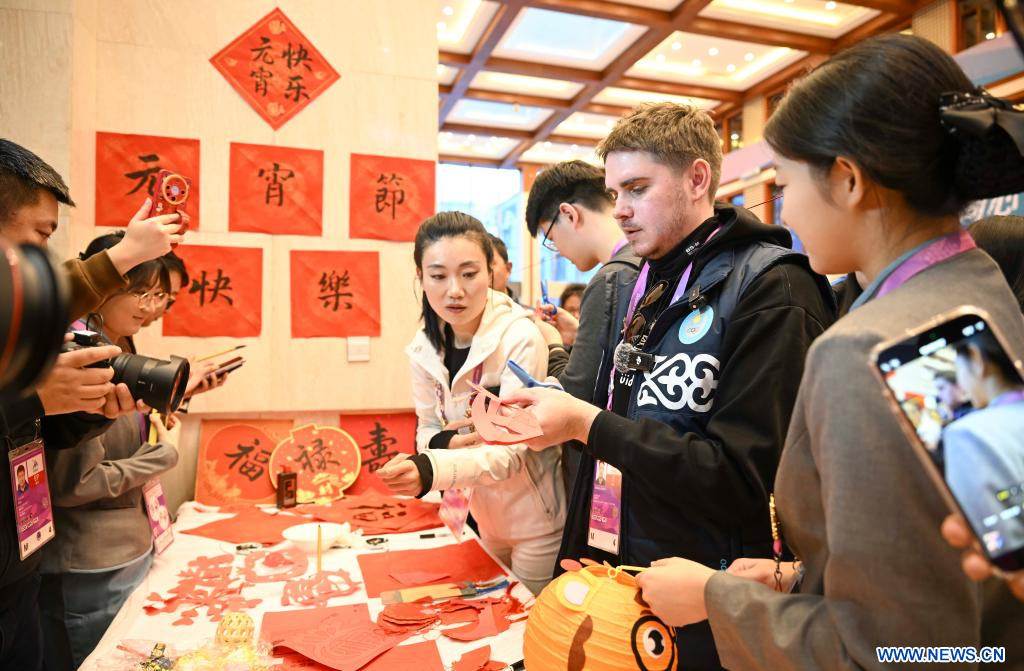 YABULI, 13 février (Xinhua) -- Un journaliste du Kazakhstan s'essaie à l'art du papier découpé pour célébrer la fête des Lanternes au centre de presse des 9es Jeux asiatiques d'hiver, à Yabuli, dans la province chinoise du Heilongjiang (nord-est), le 12 février 2025. (Photo : Hu Huhu)