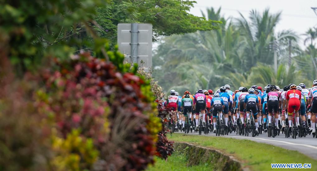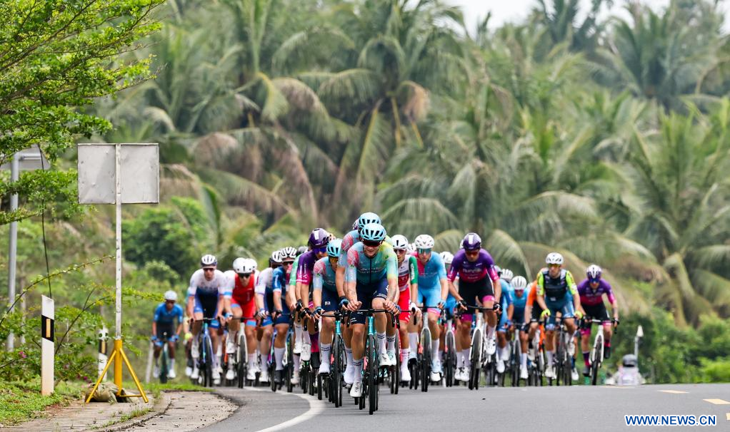 QIONGHAI, 8 avril (Xinhua) -- Des cyclistes participent à la première étape du 16e Tour de Hainan lundi à Qionghai, dans la province de Hainan, dans le sud de la Chine, le 7 avril 2025. (Photo : Yang Guanyu)
