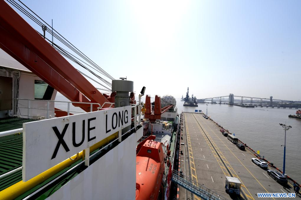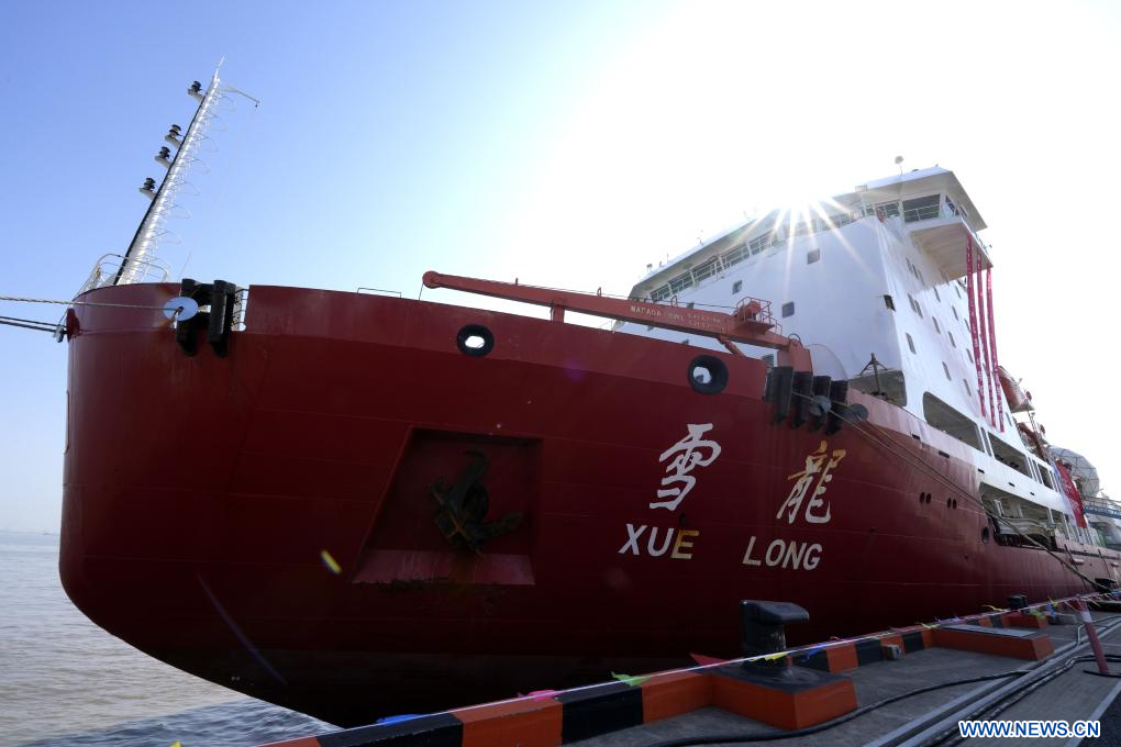 SHANGHAI, 9 avril (Xinhua) -- Le brise-glace de recherche chinois Xuelong, ou Dragon des neiges, a accosté au quai de la base à Shanghai, dans l'est de la Chine, le 8 avril 2025.