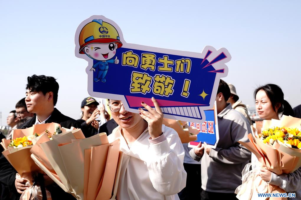 SHANGHAI, 9 avril (Xinhua) -- Les membres de la 41e expédition chinoise en Antarctique ont débarqué du brise-glace de recherche Xuelong, ou Dragon des neiges, au quai de la base à Shanghai, dans l'est de la Chine, le 8 avril 2025.