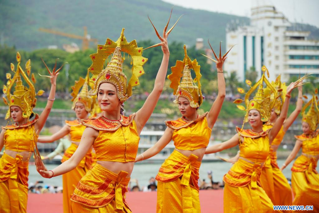 JINGHONG, 15 avril (Xinhua) -- Des actrices se produisent lors de la célébration du Nouvel An du calendrier de l'ethnie Dai à Jinghong, dans la préfecture autonome Dai de Xishuangbanna, dans la province chinoise du Yunnan (sud-ouest), le 13 avril 2025.