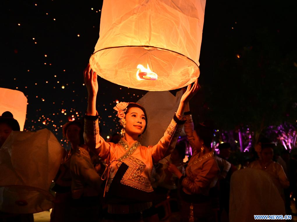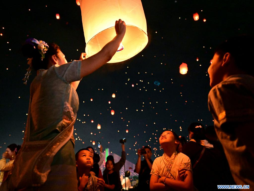 JINGHONG, 15 avril (Xinhua) -- Des gens laissent s'envoler une lanterne Kongming, un petit ballon en papier à air chaud, le long du fleuve Lancang à Jinghong, dans la préfecture autonome Dai de Xishuangbanna, dans la province chinoise du Yunnan (sud-ouest), le 13 avril 2025.