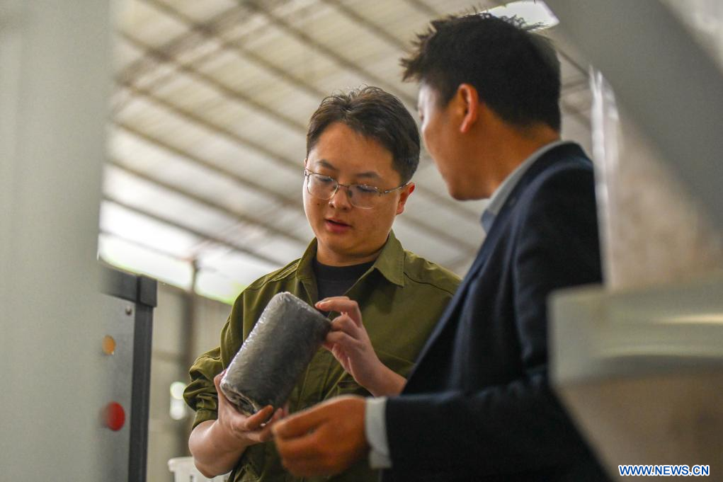 KUNMING, 3 mai (Xinhua) -- Li Runnan vérifie du matériel avec un membre du personnel dans une champignonnière du village de Wangu du district de Yanjin, dans la ville de Zhaotong, dans la province du Yunnan (sud-ouest de la Chine), le 29 avril 2025.