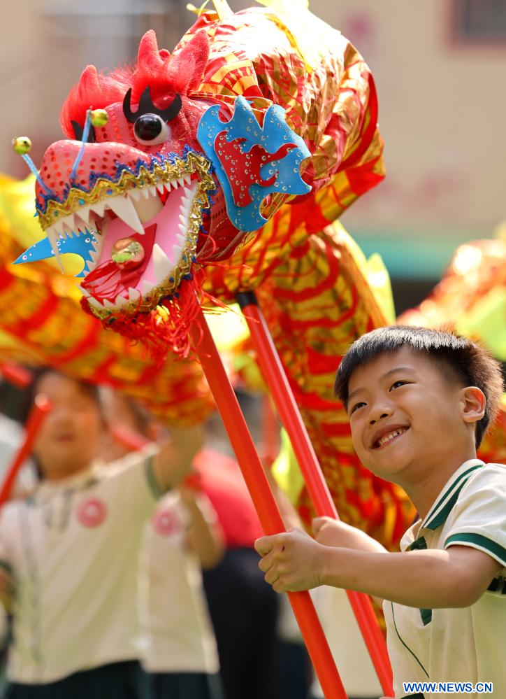 BEIJING, 29 mai (Xinhua) -- Des enfants participent à une danse du dragon dans une maternelle de la ville de Zaozhuang, dans la province chinoise du Shandong (est), le 27 mai 2025. La Fête des bateaux-dragons, également connue sous le nom de Fête Duanwu, tombe le cinquième jour du cinquième mois du calendrier lunaire chinois. Cette année, elle sera célébrée le 31 mai. (Photo : Sun Zhongzhe)