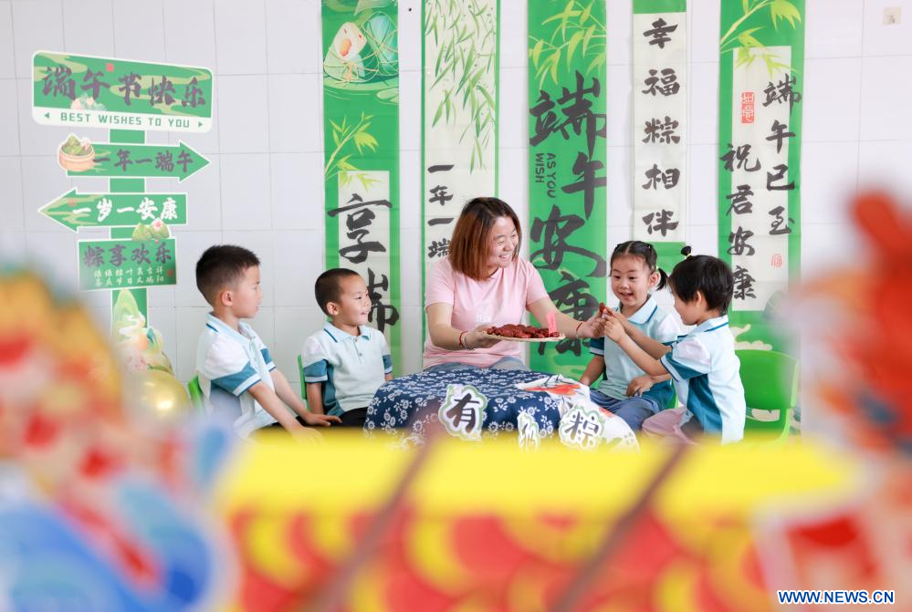 BEIJING, 29 mai (Xinhua) -- Une enseignante apprend aux enfants à préparer le zongzi, un gâteau de forme pyramidale composé de riz gluant et emballé dans des feuilles de bambou ou de roseau, dans une maternelle de la ville de Liaocheng, dans la province chinoise du Shandong (est), le 28 mai 2025. La Fête des bateaux-dragons, également connue sous le nom de Fête Duanwu, tombe le cinquième jour du cinquième mois du calendrier lunaire chinois. Cette année, elle sera célébrée le 31 mai. (Photo : Ma Hongkun)