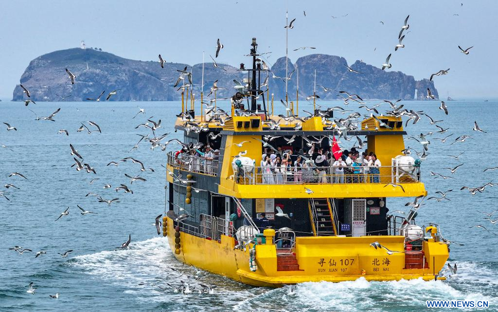 BEIJING, 3 juin (Xinhua) -- Photo aérienne de touristes profitant d'une excursion en bateau dans la ville de Rongcheng, dans la province du Shandong, dans l'est de la Chine, le 1er juin 2025.