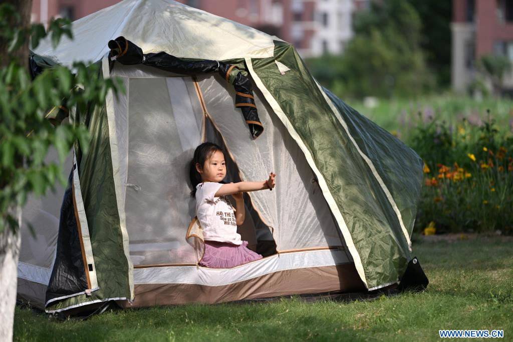 BEIJING, 3 juin (Xinhua) -- Un enfant joue dans une tente installée sur une prairie à Zhongbei, dans l'arrondissement de Xiqing, à Tianjin (nord de la Chine), le 2 juin 2025.