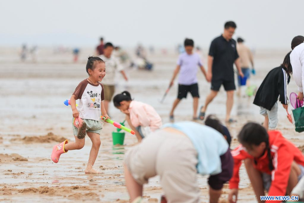 BEIJING, 3 juin (Xinhua) -- Des enfants s'amusent au bord de la mer dans une station balnéaire de l'arrondissement de Ganyu de la ville de Lianyungang, dans la province du Jiangsu, dans l'est de la Chine, le 1er juin 2025.