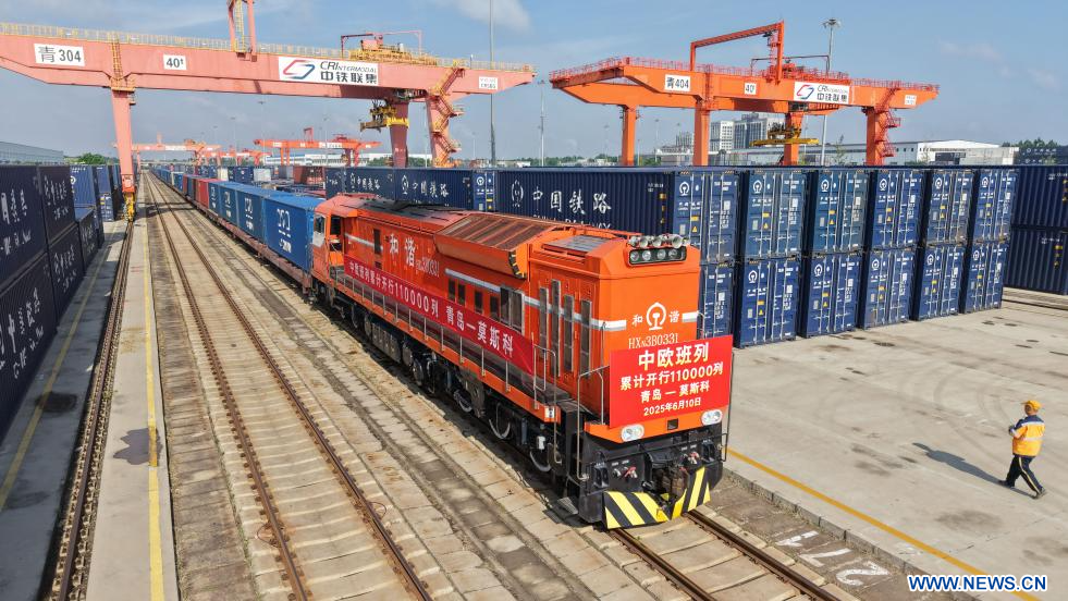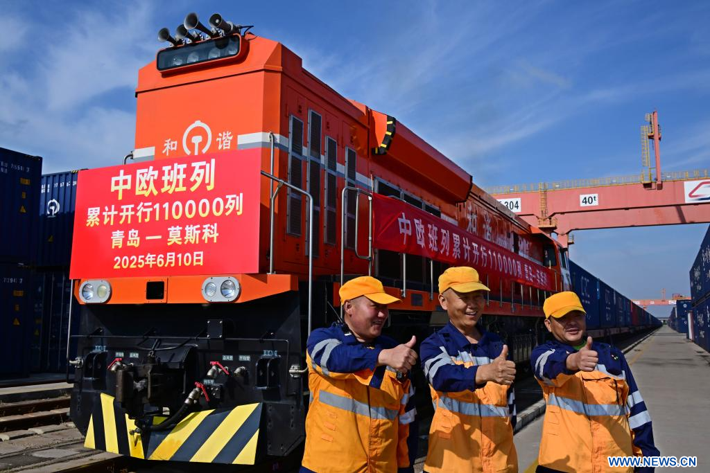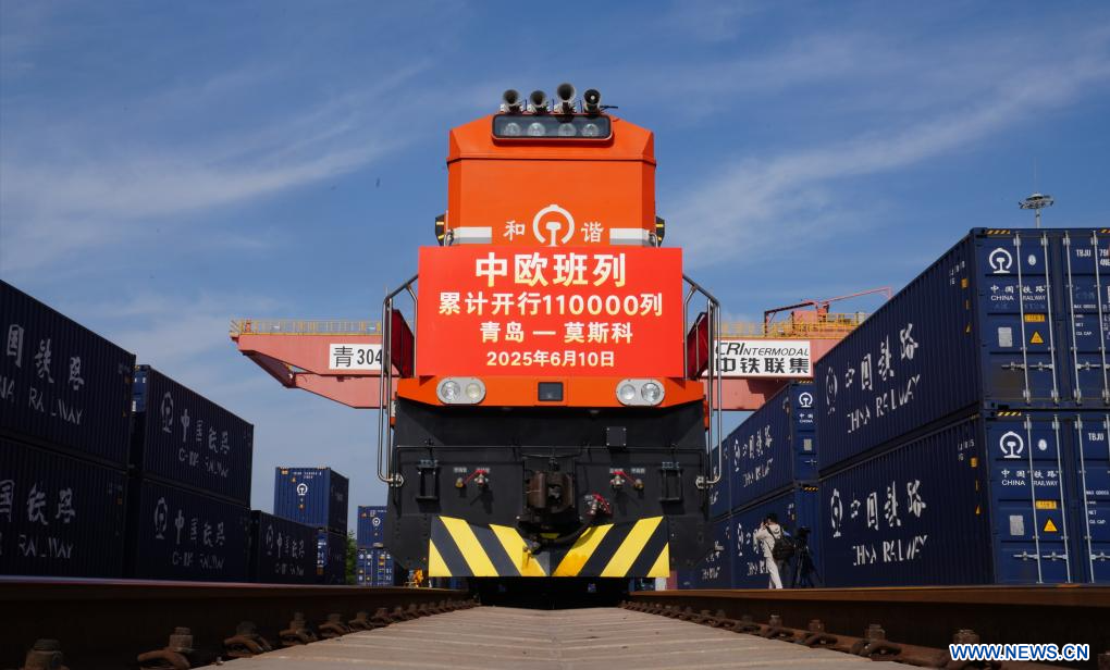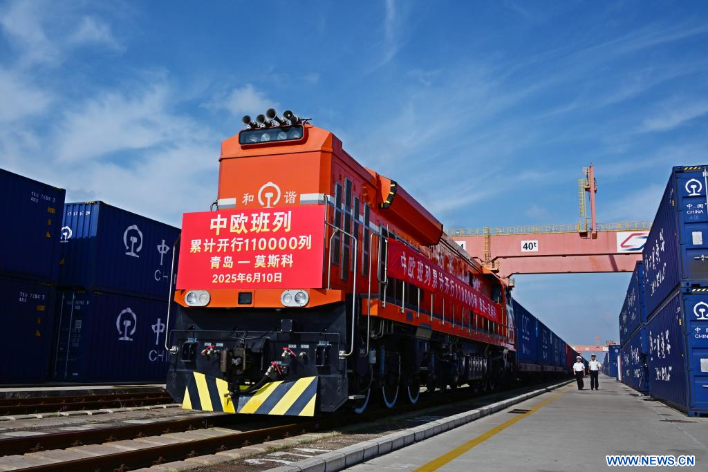 JINAN, 10 juin (Xinhua) -- Le 110.000e train de marchandises Chine-Europe est parti mardi matin de Qingdao, dans la province chinoise du Shandong (est), marquant une étape majeure dans le développement de qualité du service.