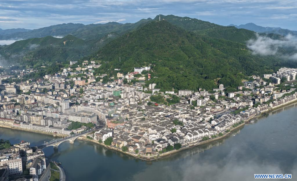 HUAIHUA, 2 juillet (Xinhua) -- Photo aérienne prise par un drone montrant la ville de Huaihua, dans la province chinoise du Hunan (centre), le 16 juin 2025.