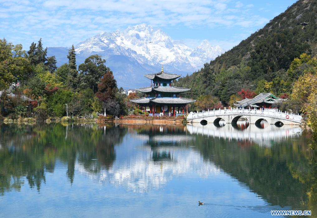 LIJIANG, 30 novembre (Xinhua) -- Photo prise depuis le parc Heilongtan du mont Yulong enneigé à Lijiang, dans la province chinoise du Yunnan (sud-ouest), le 28 novembre 2025. (Photo : Zhao Qingzu)