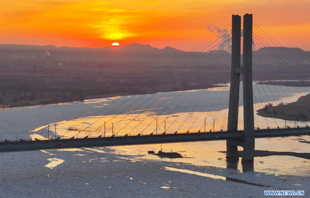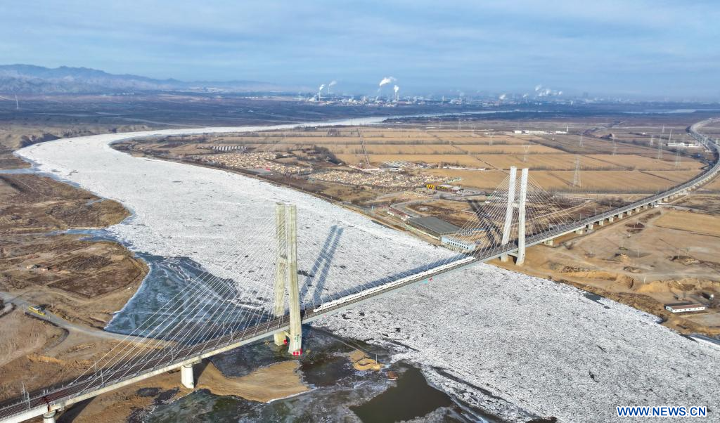 YINCHUAN, 22 janvier (Xinhua) -- Photo montrant le fleuve Jaune gelé le long de la frontière entre la ville de Shizuishan, dans la région autonome du Ningxia (nord-ouest de la Chine), et la ville de Wuhai, dans la région autonome de Mongolie intérieure (nord), le 21 janvier 2026. (Photo : Yuan Hongyan)