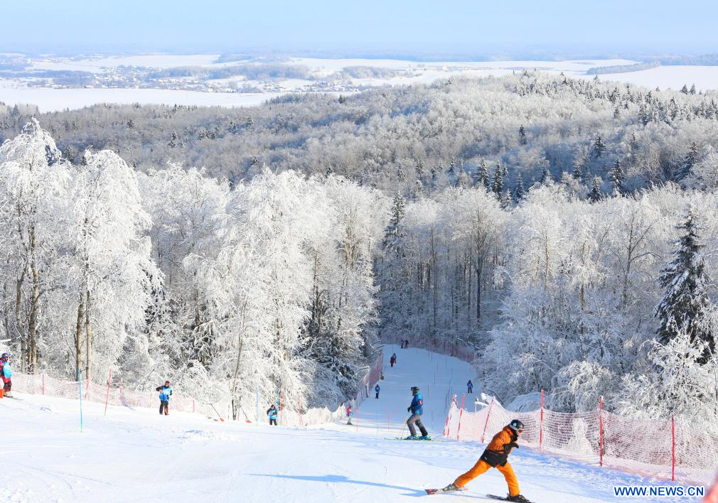 MINSK, 4 février (Xinhua) -- Des personnes font du ski dans une station de ski de la région de Minsk, au Bélarus, le 3 février 2026. (Xinhua/Henadz Zhinkov)