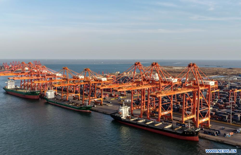 TANGSHAN, 6 février (Xinhua) -- Photo aérienne prise le 5 février 2026 montrant des navires chargés de conteneurs dans un terminal à conteneurs du port de Tangshan, dans la province chinoise du Hebei (nord). Le volume de fret du commerce extérieur dans le port de Tangshan a atteint 381,56 millions de tonnes en 2025, soit une augmentation de 2,59% par rapport à l'année précédente. (Photo : Yang Shiyao)