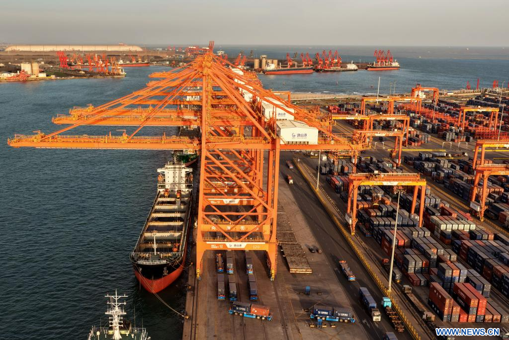TANGSHAN, 6 février (Xinhua) -- Photo aérienne prise le 5 février 2026 montrant un terminal à conteneurs du port de Tangshan, dans la province chinoise du Hebei (nord). Le volume de fret du commerce extérieur dans le port de Tangshan a atteint 381,56 millions de tonnes en 2025, soit une augmentation de 2,59% par rapport à l'année précédente. (Photo : Yang Shiyao)