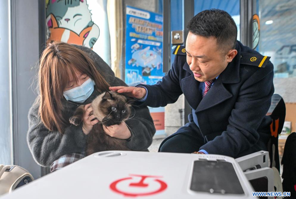 CHONGQING, 11 février (Xinhua) -- Les membres du personnel s'occupent des formalités de transport des animaux de compagnie sur un quai de la gare ferroviaire de Chongqing Ouest, dans la municipalité de Chongqing, dans le sud-ouest de la Chine, le 9 février 2026. Les autorités ferroviaires de Chongqing ont lancé un service pilote de transport d'animaux de compagnie sur les trains à grande vitesse sur certaines lignes durant la période du pic des voyages de la fête du Printemps.