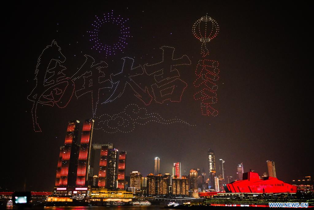 CHONGQING, 19 février (Xinhua) -- Un spectacle de lumières par drone ayant pour thème "Paysage majestueux, Chongqing dynamique" est présenté dans la municipalité de Chongqing, dans le sud-ouest de la Chine, le 17 février 2026. (Photo : Wang Quanchao)