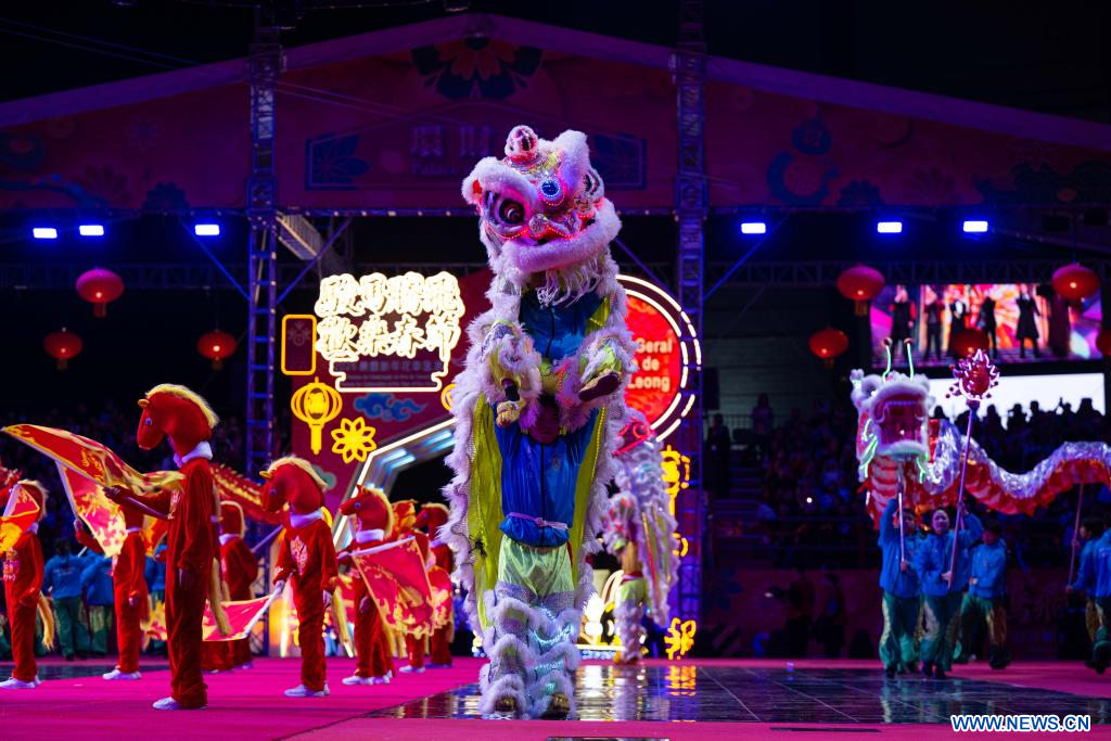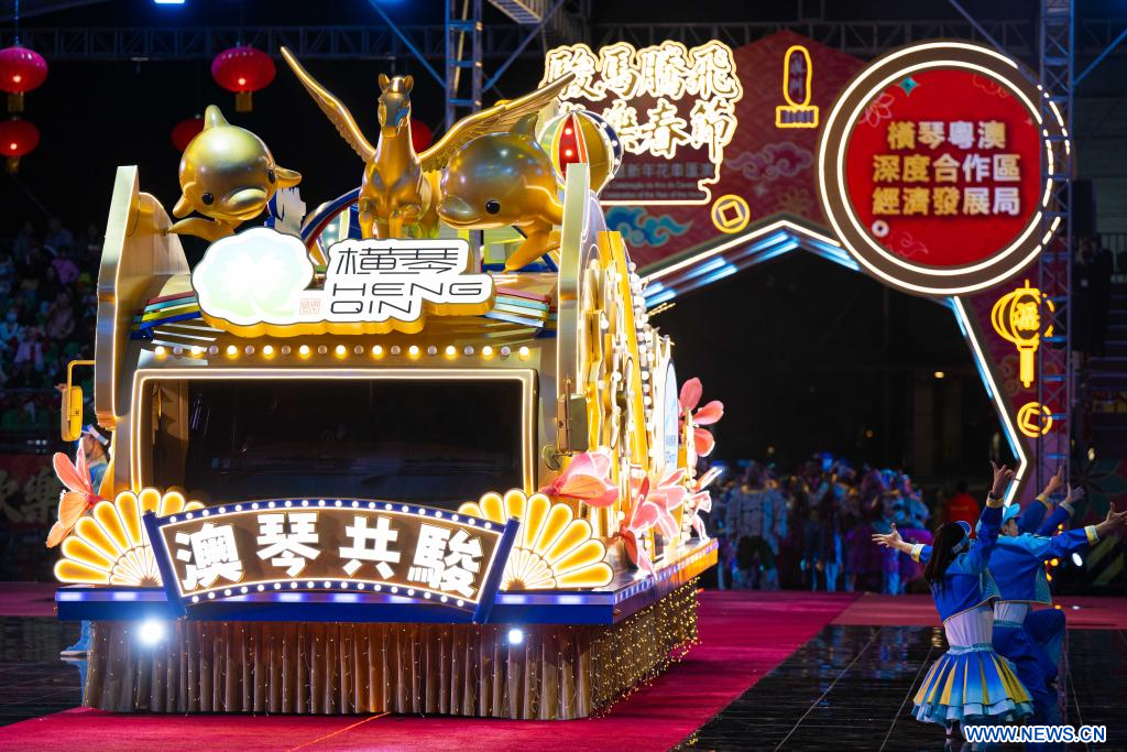 MACAO, 20 février (Xinhua) -- Un char décoré participe à un défilé célébrant le Nouvel An chinois à Macao, dans le sud de la Chine, le 19 février 2026.