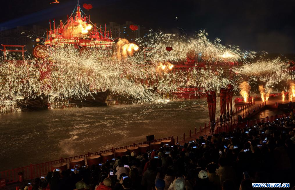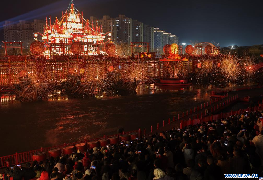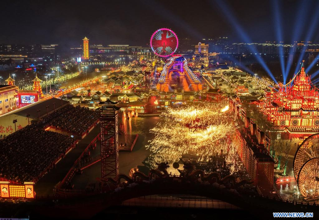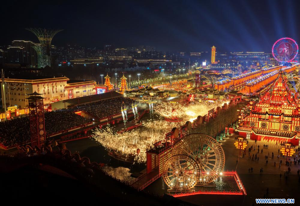 SHIJIAZHUANG, 22 février (Xinhua) -- Vue aérienne d'un spectacle de feux d'artifice de fer en fusion dans un quartier culturel dans l'arrondissement de Fengnan à Tangshan, ville de la province chinoise du Hebei (nord), le 20 février 2026. (Photo : Yang Shiyao)