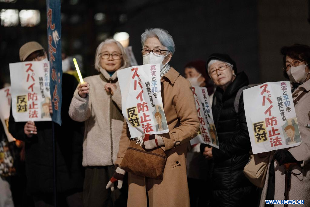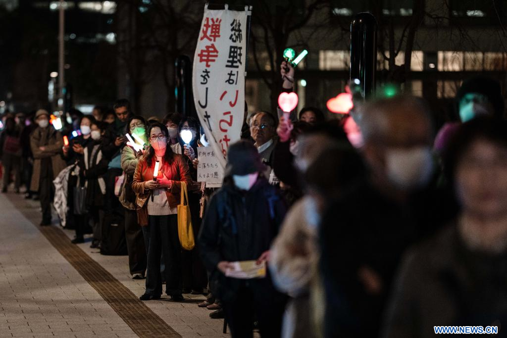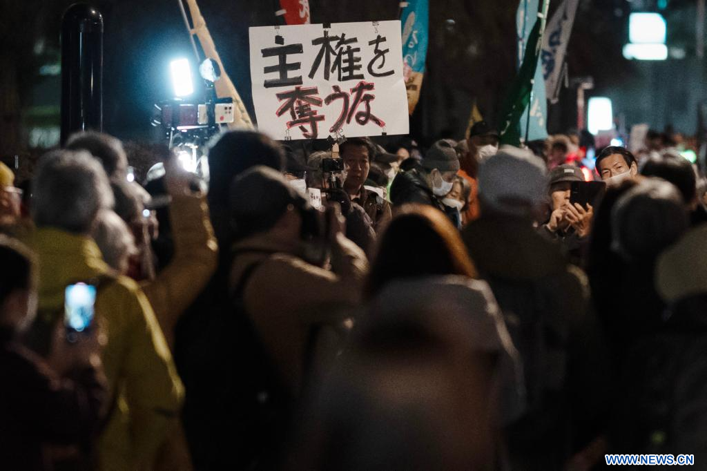 TOKYO, 25 février (Xinhua) -- Des personnes manifestent devant le Second immeuble de bureaux des membres de la Chambre des représentants à Tokyo, au Japon, le 24 février 2026. Une foule importante s'est rassemblée mardi soir à Tokyo pour protester contre les mesures politiques prises par la Première ministre Sanae Takaichi, notamment l'accélération de la révision constitutionnelle, l'expansion des capacités militaires et le renforcement des fonctions de renseignement national. (Xinhua/Jia Haocheng)