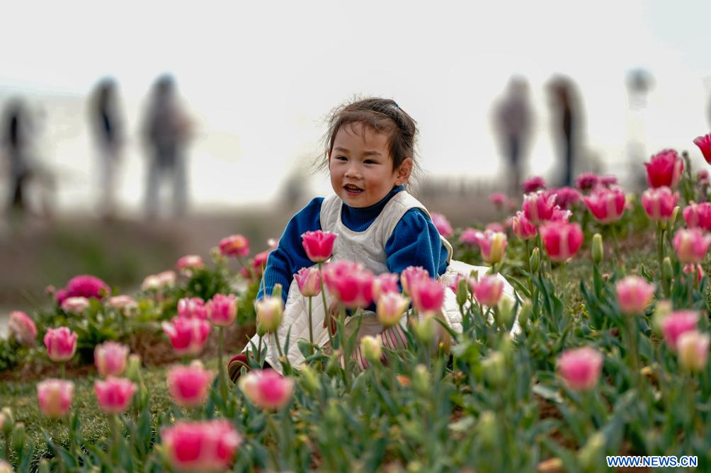 KUNMING, 27 février (Xinhua) -- Une fillette pose pour des photos au milieu des tulipes au bord du lac Dianchi, dans la ville de Kunming de la province du Yunnan, dans le sud-ouest de la Chine, le 26 février 2026. (Photo : Chen Xinbo)