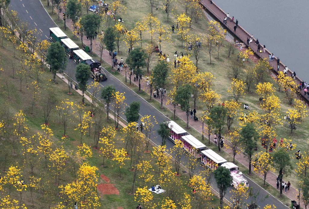 NANNING, 9 mars (Xinhua) -- Des visiteurs admirent des fleurs dans une zone pittoresque de Nanning, dans la région autonome Zhuang du Guangxi (sud de la Chine), le 8 mars 2026. (Photo : Zhou Hua)