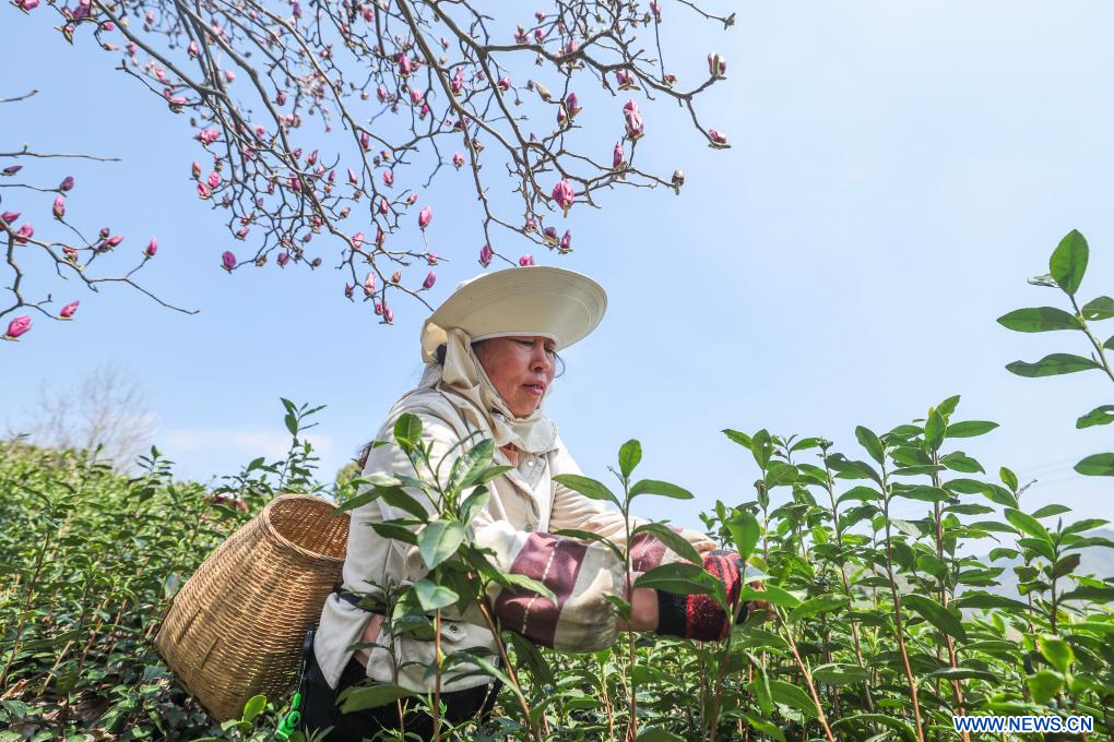WUYI, 11 mars (Xinhua) -- Une agricultrice récolte des feuilles de thé de printemps dans un jardin de thé au district de Wuyi à Jinhua, ville de la province chinoise du Zhejiang (est), le 10 mars 2026.