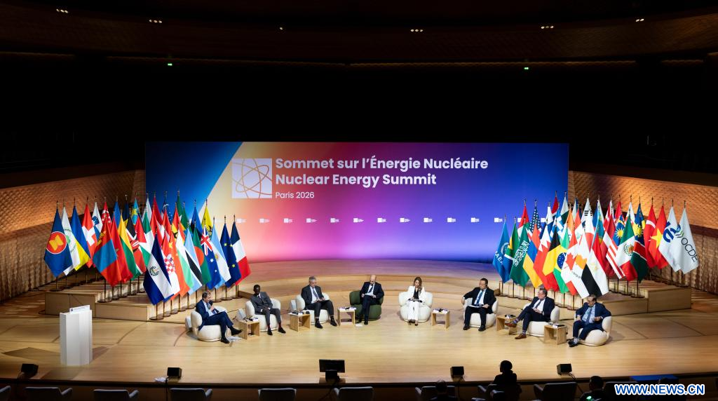 PARIS, 11 mars (Xinhua) -- Photo prise le 10 mars 2026 montrant une table ronde lors du deuxième Sommet sur l'énergie nucléaire à Paris, en France. (Xinhua/Wu Huiwo)