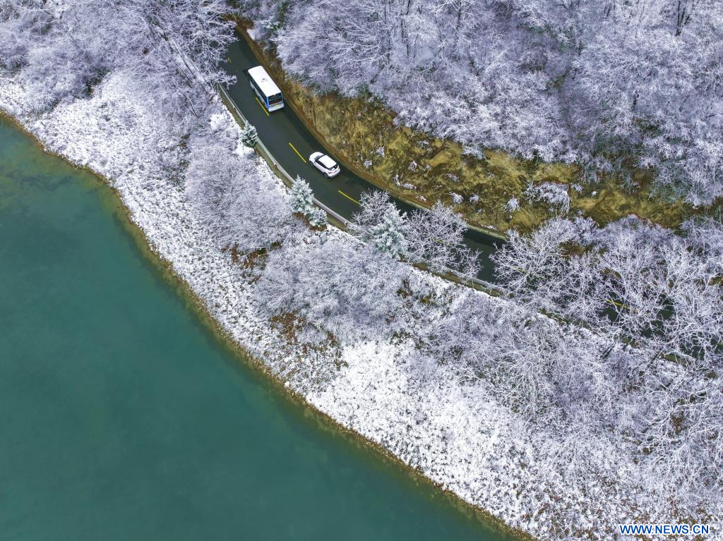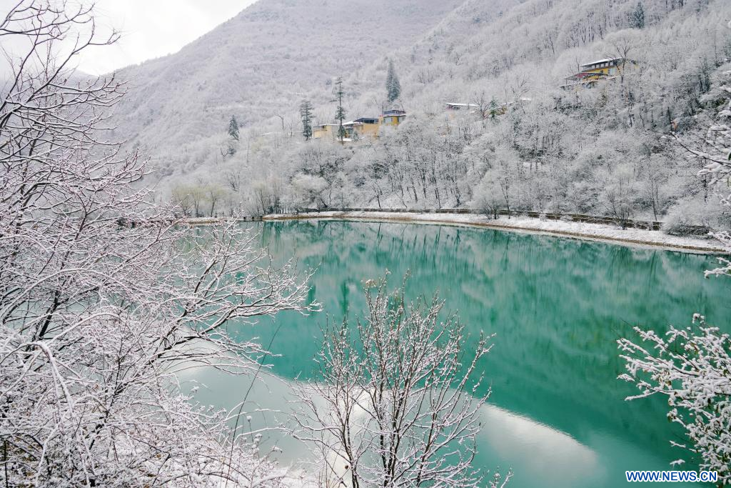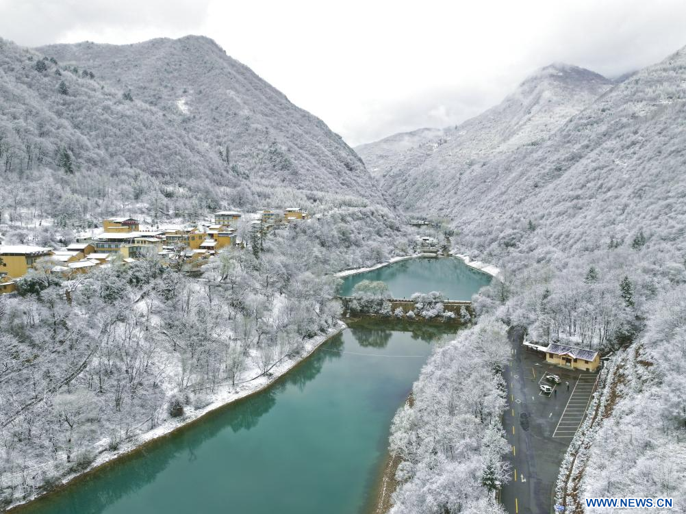 DANGCHANG, 19 mars (Xinhua) -- Paysage de la zone touristique de Guan'egou après une chute de neige, dans le district de Dangchang, à Longnan, dans la province chinoise du Gansu (nord-ouest), le 18 mars 2026. (Photo : Liu Hui)